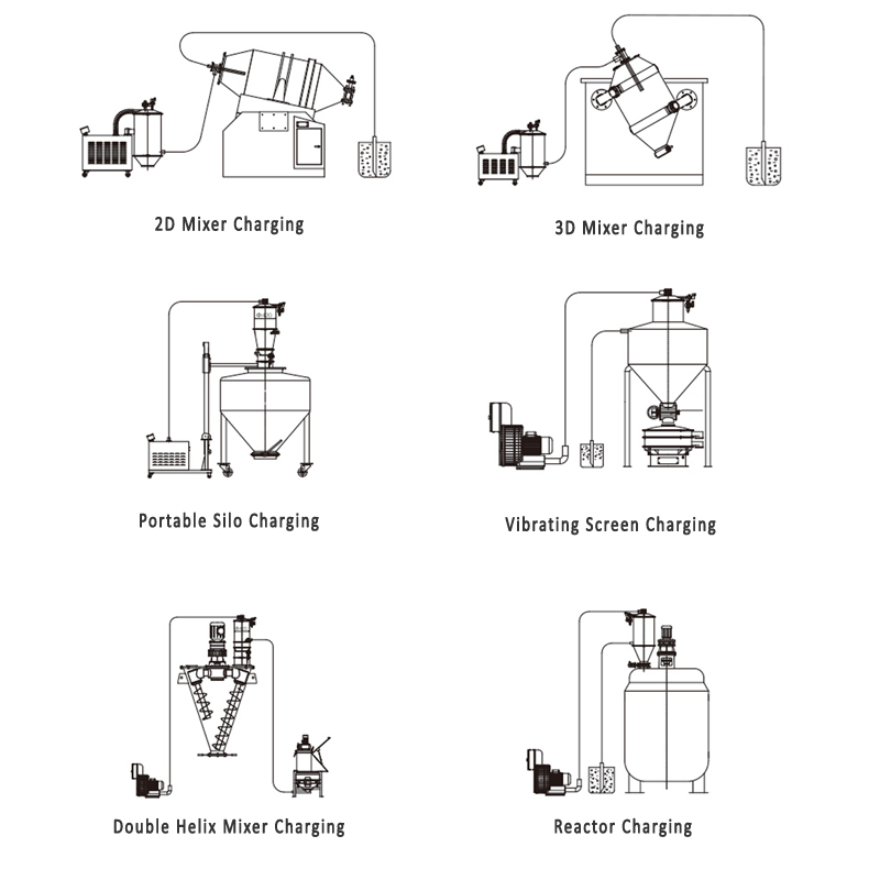 A vacuum feeder is a vacuum conveying device designed for powdery materials, granular materials, and mixed powdery-granular materials. It can automatically convey various materials into the hoppers of equipment such as silos, packaging machines, injection molding machines, and crushers. It can also directly convey mixed materials into mixers (e.g., V-type mixers, two-dimensional mixers, three-dimensional mixers, etc.). This equipment reduces workers' labor intensity and solves problems such as dust overflow during feeding. It is an essential device for pharmaceutical factories and food factories to obtain GMP certification, promote clean production, and achieve standardized workshop operations.